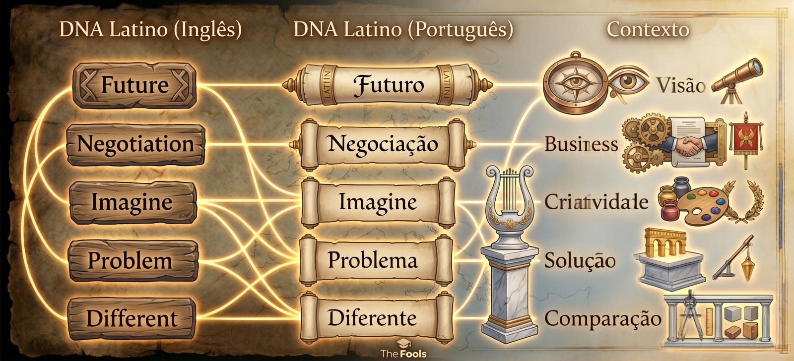 A Base Latina (A Mente): Aqui é onde o jogo vira para nós. Cerca de 30% a 45% do vocabulário acadêmico e profissional do inglês vem do Latim e do Francês.