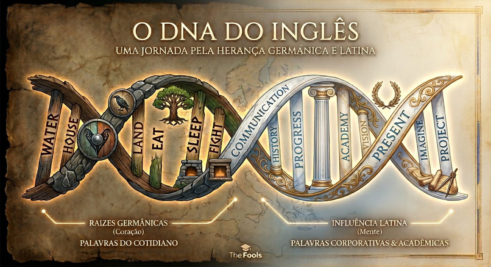 A Base Germânica (O Coração): São as palavras curtas, intensas e do dia a dia. Water, Earth, Sleep, Eat, House. É o inglês das ruas, das emoções e da sobrevivência.